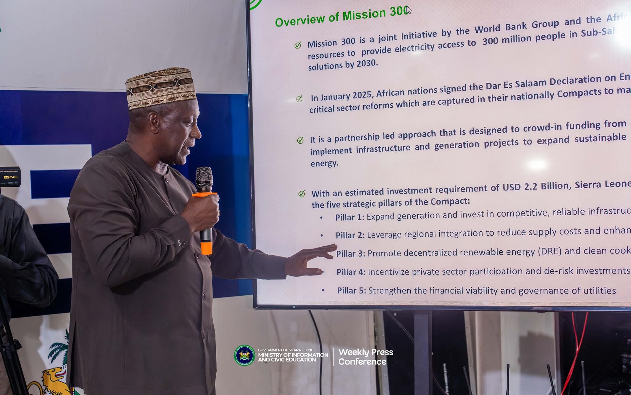 Dr. Kandeh Kolleh Yumkella, Energy Sector Lead and Chairman of Sierra Leone’s Presidential Initiative on Climate Change, Renewable Energy and Food Security, has shared an extensive update on the nation’s landmark energy project, Mission 300, valued at $2.2 billion. He made the announcement during the weekly press briefing organized by the Ministry of Information and Civic Education on Tuesday, 7th October 2025.