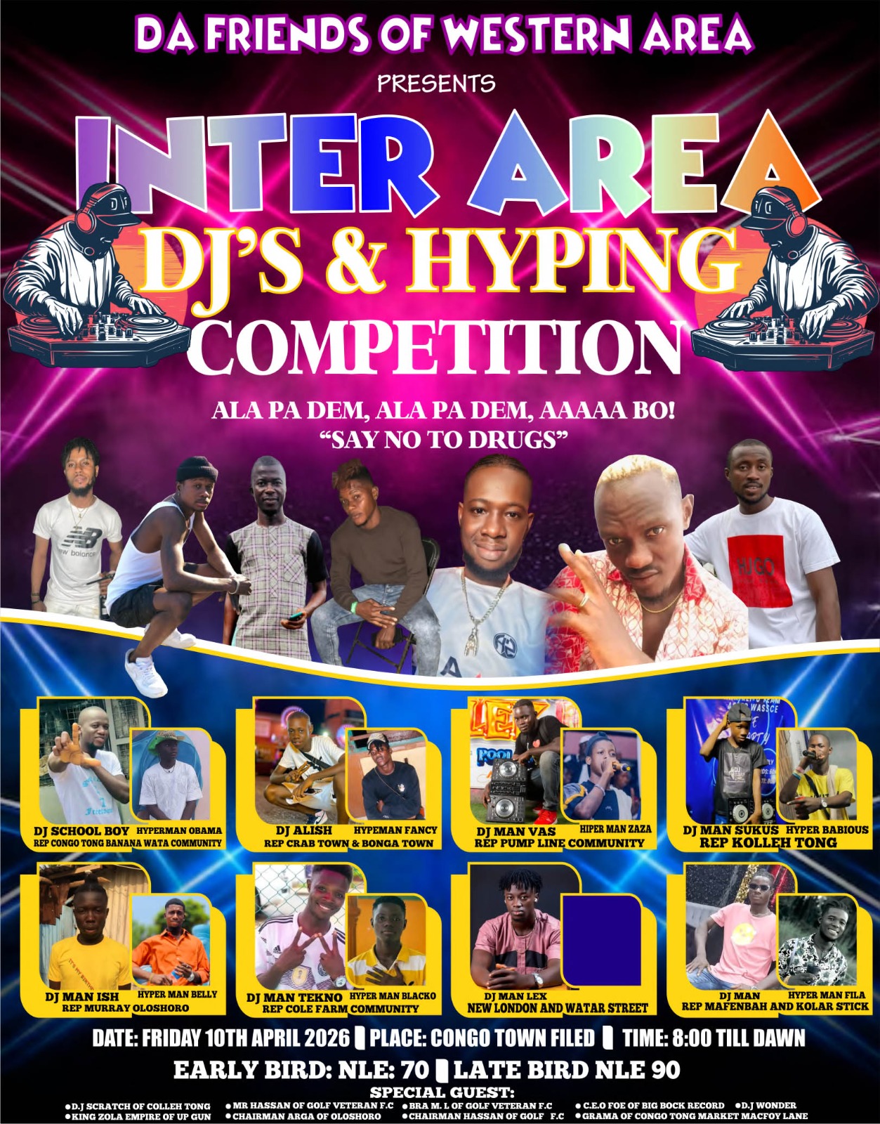 The competition, scheduled for Friday 10 April 2026 at Congo Town Field, is expected to attract music lovers, DJs, hype men and youth groups from different communities across the Western Area. Organisers say the event will start at 8 pm and continue until dawn, promising a night filled with music, creativity and friendly competition.